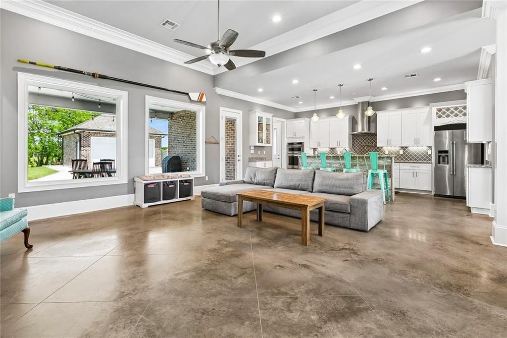 After Stepping onto the inviting Front Porch, as you Enter this Home..You will Enjoy an Open Concept Floor Plan featuring Crown Molding Throughout Living Areas along with Primary Bedrm and Bath. Stained Concrete Floors in Living Area. Equipped with Surround Sound, this Home is Great for Large Gatherings at the Holidays or Entertaining any Time! Walk into a Dining Area with oversized Den, all with 12Ft Tray Ceilings, Large Picture Windows overlooking an additional Outdoor Covered Patio Space, great for Entertaining.. this Outdoor Covered Patio has a Built in Wood Burning Fireplace and Mounted Television..a must for Football Season! The Beautiful Open Kitchen with Eat at Bar, Granite Counters, Lots of Lighting, Beautiful Glass Tile Backsplash, Stainless Appliances, Lots of Cabinetry along with an Oversized Butler's Pantry is a Plus! You'll also enjoy a Spacious Laundry Room off of the Kitchen. Primary Bedroom has a Sitting Room overlooking backyard, great for a relaxing/reading space or can be used as a home office. Ensuite Primary Bath has a Spacious Tiled Custom Designed Walk In Shower, Double Vanities and a Makeup Area, Tub and an Abundance of Closet Space. This Home features a Separate Office off of Dining/Den that can be used as a 4th Bedroom, Playroom or Media Room. Oversized Lot, Circular Drive for Additional Parking..Hugh Backyard, Rear Yard Access, Detached Brick 2 Car Garage with Lots of Storage..along with a Full House Generator.. a Big Plus! Must See this Beauty to Appreciate! Assumable 3% VA Loan for Eligible Buyers!