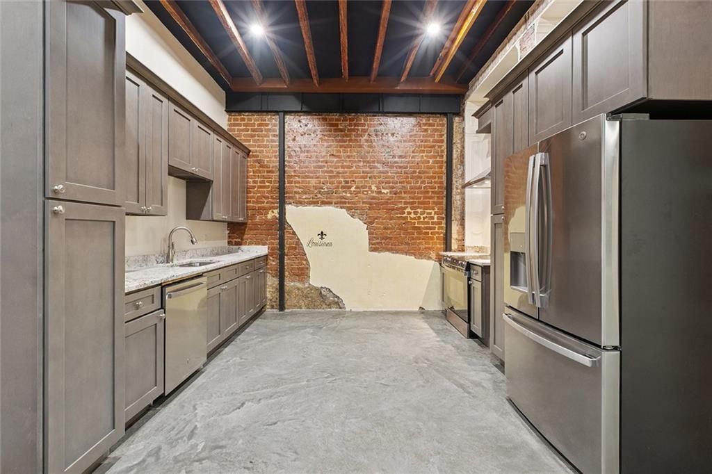 Beautifully restored 2 bedroom apartment on the streetcar line in the CBD! Can be available furnished - inquire for more info. First floor apartment in historic building features private outdoor space, soaring ceilings, exposed brick walls and architectural details. Updated in 2025 for modern lifestyles with washer/dryer in unit, stainless steel appliances, dishwasher, fridge, range/oven, and granite countertops. 1/2 block to FQ. Pets considered on a case by case basis. Water and electricity included.