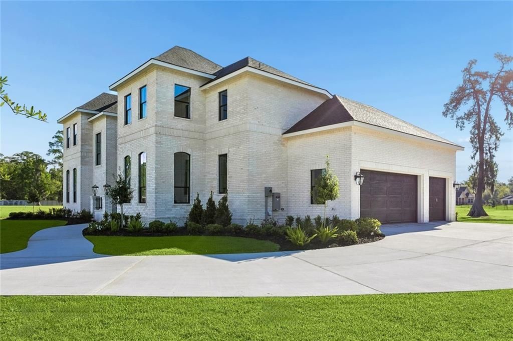 This luxury new construction home in English Turn, designed by Mark Schroeder AIA and developed by SEE Developers LLC, offers an impressive blend of modern amenities and elegant features. Located next to a park, the home welcomes you through a custom steel arched door into a double-height foyer with a grand chandelier and soaring 12-foot ceilings. The chef's kitchen boasts Jenn Air Professional NOIR appliances, two spacious islands, and a wine cooler in the butler's pantry. Wide plank hardwood floors flow throughout, with the family room featuring a gas fireplace and built-in shelving, and the dining room highlighted by large curved windows. Architectural panels, extensive millwork, and crown molding add sophistication, while the primary suite offers a serene bath with a freestanding tub. A mudroom and first-floor laundry ensure convenience, with upstairs providing a dedicated office, large bedrooms, and attic storage. Professional landscaping with irrigation, intricate brick detailing, and Ply-gem windows ensure both curb appeal and durability. A covered porch off the family room is ready for a future outdoor kitchen, and the lot provides space for a pool. Additional features include custom closets, Crate & Barrel lighting, LED recessed lighting, Wi-Fi thermostats, Ring cameras at every entrance, a three-car garage with electric car charging outlet, high-quality paint, and generator hookups for added preparedness. Located in English Turn, residents enjoy 24-hour private security, as well as access to swimming, tennis, golf, parks, and trails, supporting an active and secure lifestyle.