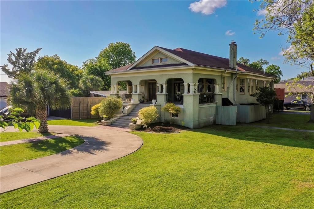 Spacious welcoming front porch greets you as you step back into the early 1900 era (1909-1912), when this gorgeous raised-basement, Craftsman-style home was built. Many of the timeless architectural characteristics in this 100+ age beauty have remained throughout the years-oak wood flooring, built-in bookcases, Cypress wood panel doors and hardware, windows, chandelier, baseboard vents, corner cupboard, fireplaces, plaster walls, moldings, concrete stucco...including a vintage bathroom, too many details to list, have to see for yourself to fully appreciate this charming property. The renovated Kitchen has an abundance of natural light, features ample Cypress cabinetry and shelves, gas cooking, granite counters, SS appliances, and a walk-in pantry with stairs to attic. Owner occupies the main level that consists of 3 bedrooms, 2 baths, living and dining areas, 2 fireplaces, sunroom, kitchen, and a large wooden deck off the breakfast room. This 2170 sq ft of living space does not include the approx 1010 sq ft in the Basement Apartment since ceiling height is 6'9". Income-producing Apartment has 2 bedrooms, 1 bath, living and dining areas, a full kitchen, washer/dryer, plus a private outdoor courtyard and separate exterior entrance...currently tenant occupied, or an ideal private extended family-stay, or accommodations for out of town guests. Located on a rare oversized corner, double lot with front circular driveway and side off-street parking with carport. Additional basement storage area has 2 separate exterior entrances, along with stairs leading into kitchen from carport. Needs just a little TLC to bring this stunning property back to it's beautiful grandeur. Flood Zone X