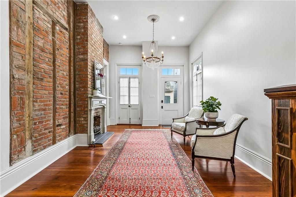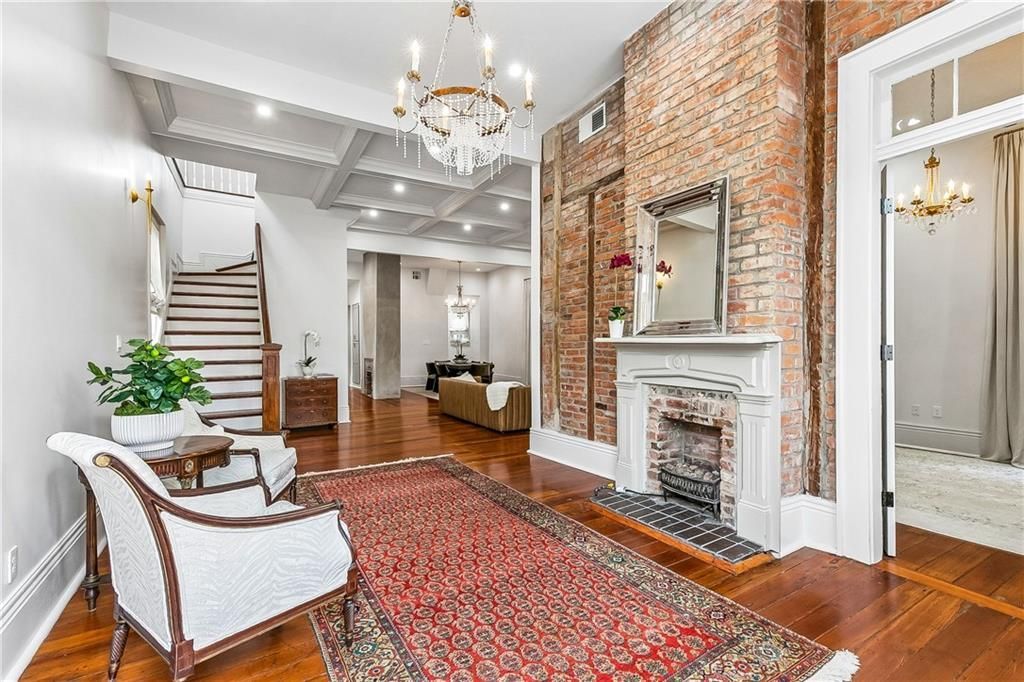 This lavishly appointed creole cottage has been reinvented with the finest of modern day conveniences while keeping its historic charm including original hardwood floors, exposed brick walls & high ceilings. No detail spared in this renovation including luxurious finishes, new fixtures, roof, electrical, plumbing & HVAC. The Kitchen has been completely remodeled & modernized with an entire ensemble of Thermador Appliances, including 6 burner range, drawer microwave, ice maker & wine fridge. Exquisite design choices have been used throughout: stucco fireplaces, ornate lighting, stone floating vanity and custom drapery are just a few. Exposed brick & stucco fireplaces provide functionality & ambiance. Thoughtfully located away from entertaining areas, the first floor primary suite provides a serene escape with sun dappled views of vine covered walls. The luxurious spa like en suite bath has a spacious walk in shower, freestanding tub, double vanity & French door access to pool. Not to be outdone, the primary suite also includes an enormous walk-in closet for all your needs. Residence also features three beautifully appointed guest suites, each with ensuite bath. Located just off the foyer, the first exudes architectural charm with tall ceilings, fireplace, and exposed brick walls. Upstairs are two elegant guest suites each with beautifully restored original wood ceilings, ultra-luxurious en suite baths, rooftop views & large walk-in closets. A conveniently located powder room with custom stone floating vanity & separate fully equipped laundry room are also found on the first floor. Outdoor living & entertaining is at its finest in the pool area with its luxurious bath plus storage space located just off the beautiful private flagstone courtyard with saltwater pool & waterfall surrounded by tall vine draped brick & masonry walls for the Quintessential French Quarter experience. Gated off street parking across the street will transfer.