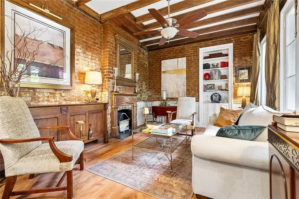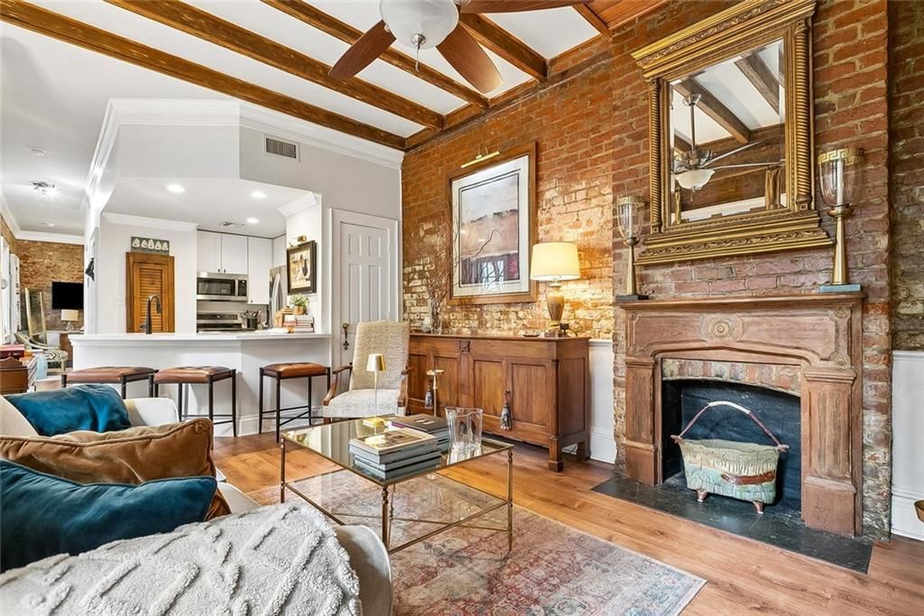 Experience the joy of the French Quarter in this 1BR/1BA ground-floor condo. The interior features architectural details including 10-foot ceilings, original exposed wood beams, exposed brick, plaster walls, and a fireplace mantel in the living area. The kitchen is equipped with white shaker cabinets, stone and granite counters, and a gas range, opening directly into the living area. The bathroom features a spa tub/shower with a double vanity. French doors and windows flood the space with light and open to a lush courtyard, framed by shutters. Convenience features include in-unit laundry, elegant finishes, and no stairs to navigate after a day of fun in the city!